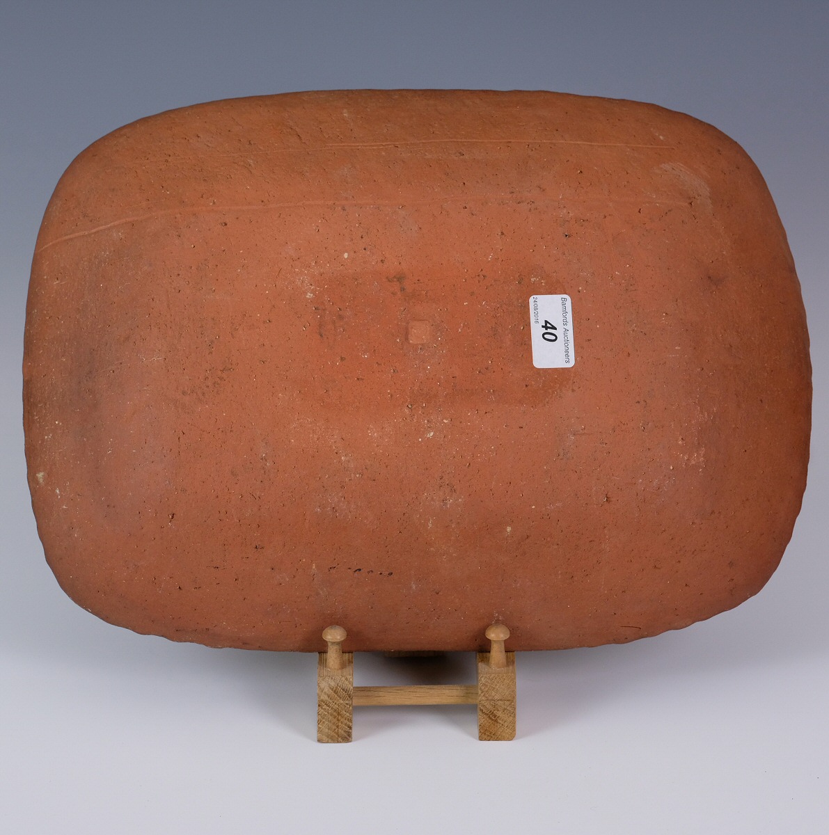 This slip trailed earthenware dish with a scalloped border measures 40cm by 30cm. Although David made a few of these dishes in collaboration with Clive Bowen in 2001, this is an original that David made in the 1950s at Lowerdown Pottery. The dish was a lucky auction purchase which went under most people's radar as it was described as "an art pottery charger marked LD".